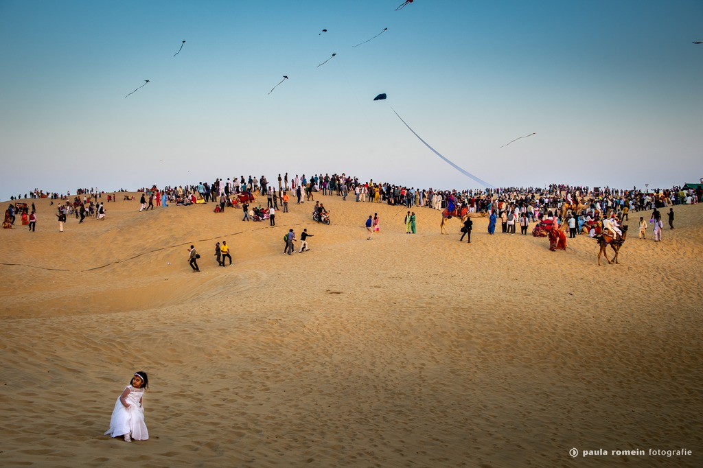 Die middag is er een enorme massa op de been voor het festival. Er staan diverse tentjes en we zouden ergens een omelet moeten kunnen scoren maar we houden het bij een zakje pinda’s. Bij de races staan zoveel mensen die naar mijn idee al uren zitten te wachten. Na een half uur dat wij er zijn gaat het dan toch echt gebeuren. We zijn een beetje brutaal en gaan bij het hek zitten. Op een stoel zitten ergens achterin gaat het niet worden als we willen fotograferen. Ik gokte op de kamelen dicht in de buurt maar de afstand is nog te ver en na de eerste twee races ga ik toch snel even terug naar de tent om mijn telelens erop te zetten. Doet die ook nog wat deze reis. Bij de races wil ik geen lenzen wisselen want er is zoveel stof hier in de woestijn. Ik fotografeer ook daar met mijn plastic hoes tegen stof en water. Dit soort fijnstof is zo slecht voor camera apparatuur. Als ik mijn telelens erop heb zitten kan ik nog een race fotograferen en dan is daarna de chaos zo groot dat ik Rolf niet meer kan terugvinden. We gaan dus allebei onze eigen weg. Ik fotografeer de kamelen zoveel mogelijk met hun eigenaren, maar op de meeste zitten toeristen. Verder loop ik richting de tien vliegers die ik in de verte zie. Ik hoop wel dat er later nog meer vliegers te zien zijn en dat de ballonnen wel opgaan, want die horen wel in het beeld dat ik voor ogen heb. Na vele meters door het diepe zand te hebben afgelegd, blijkt toch echt dat hier duizenden mensen op de been zijn voor welgeteld deze 10 vliegers. Het is echter heel lastig om een interessant beeld te krijgen. Ik zie een paar mooie vliegers en kamelen met mooie berijders erop maar rust komt er niet in het beeld. Het is zo’n chaos. Ondertussen wordt er wel 10 keer gevraagd of ik met mensen op de foto wil. Ik begrijp er niets van, maar schijnbaar ben ik net zo bijzonder voor hen als dat ik de Indiërs vind. En dat met mijn haar onder het stof dat hoognodig een kapper nodig heeft en mijn witte broek die allang niet meer wit is. Het is rond half 8 dat ik weer bij onze tent kom en dus allang donker. Rolf vraagt zich vast af waar ik blijf. Maar hij is er nog niet en Raj, die even door dj speelt, heeft hem ook al die tijd niet gezien. Ik ben benieuwd naar zijn beelden terwijl ik de mijne bekijk. Een half uur later komt Raj vragen of Rolf er al is en ik antwoord dat het niet het geval is en ik mij nu wel afvraag waar hij blijft want fotograferen is nu echt niet meer mogelijk. We kijken naar een balloon die ze achter onze tent toch naar boven proberen te krijgen. Door de wind zijn ze helaas niet opgestegen en bij deze gaat het ook niet lukken. Inmiddels komt Rolf ook aangelopen. We zijn op dezelfde plek geweest maar door de mensenmassa zijn we elkaar toch niet tegengekomen.